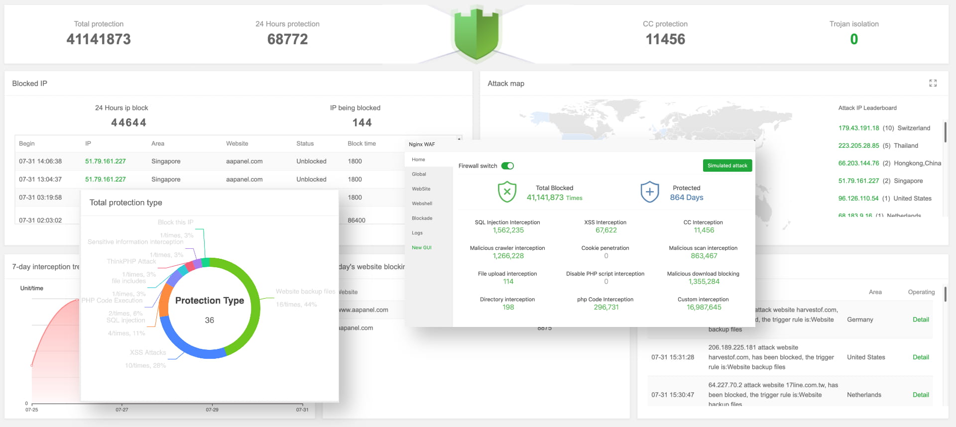 CC attack is a common variant of DDOS attack on the Internet. It imitates normal users and makes a large number of requests to your website, eventually exhausting your server resources. aaPanel Nginx WAF can effectively defend against