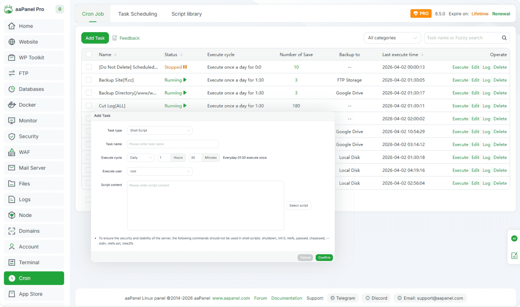 Crontab can be added and executed periodically, shell scripts are supported, website, database backup and log cutting are provided.