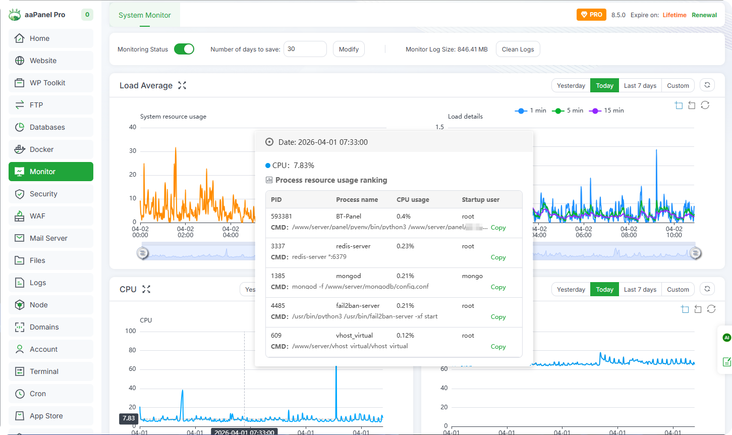 CPU, RAM, Disk IO, Network IO monitoring, you can set the number of days to save the record and check the data of a certain day at will.